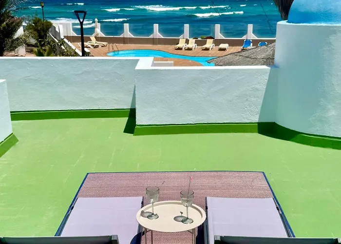 Situada a poco más de 5 minutos a pie del Maxo's Gym, la villa Geranio House, Beachfront, Pool, Corralejo ofrece una terraza con vistas al mar.